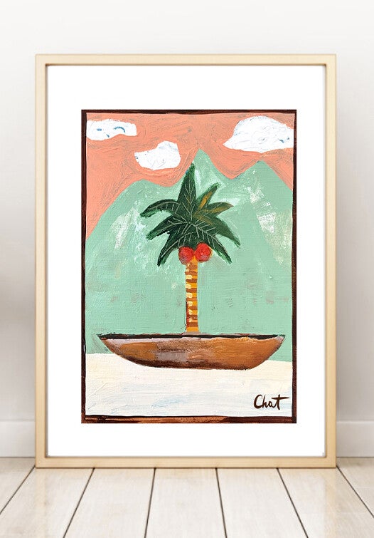 Cette œuvre mêle la douceur des teintes pastel à la poésie d’un palmier solitaire porté par une pirogue imaginaire. Entre naïveté assumée et abstraction légère, elle célèbre l’évasion, la simplicité et la magie des paysages tropicaux. Une pièce solaire qui apporte une touche de rêve et de douceur à tout intérieur. »